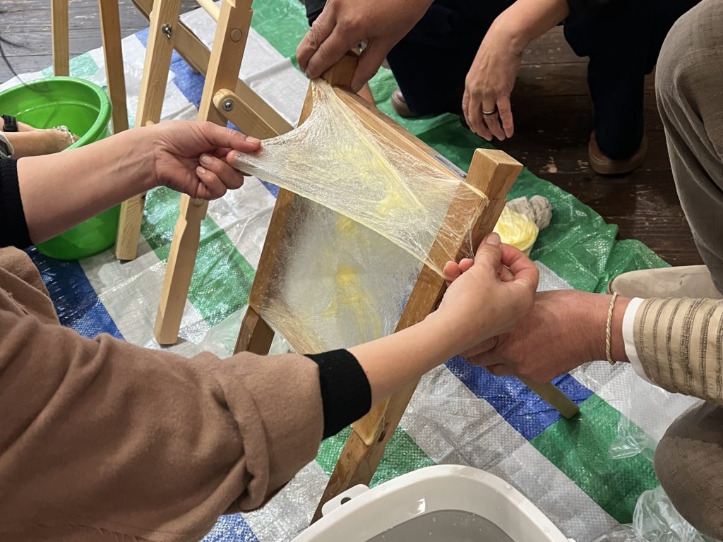 1日目の講演会のあとには、塩野屋が育てた蚕の繭を使って真綿づくりの体験会もご用意いたしました。