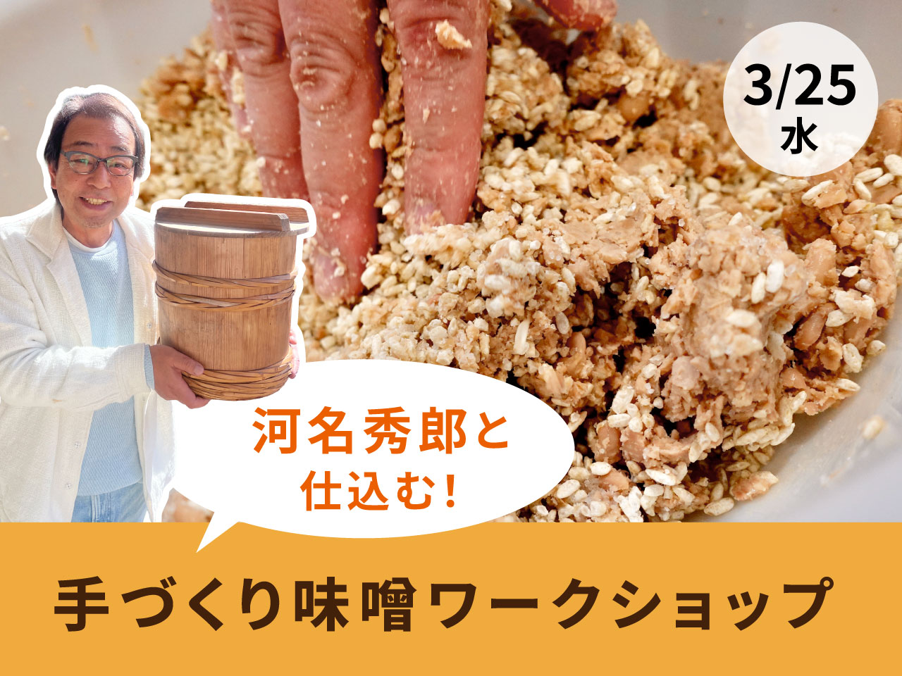 ナチュラル・ハーモニー代表・河名秀郎と一緒に味噌づくりを行います。