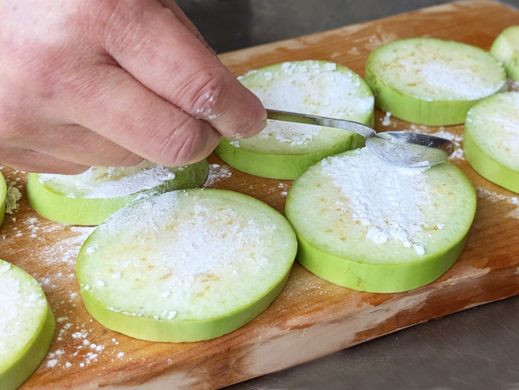 ③青なすはヘタを取り、1㎝厚さの輪切りにし、さっと水にさらし水気をしっかりふき取る。