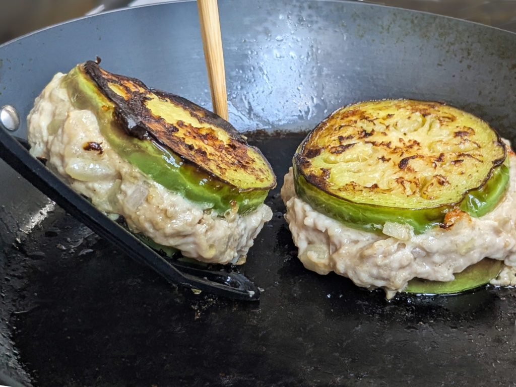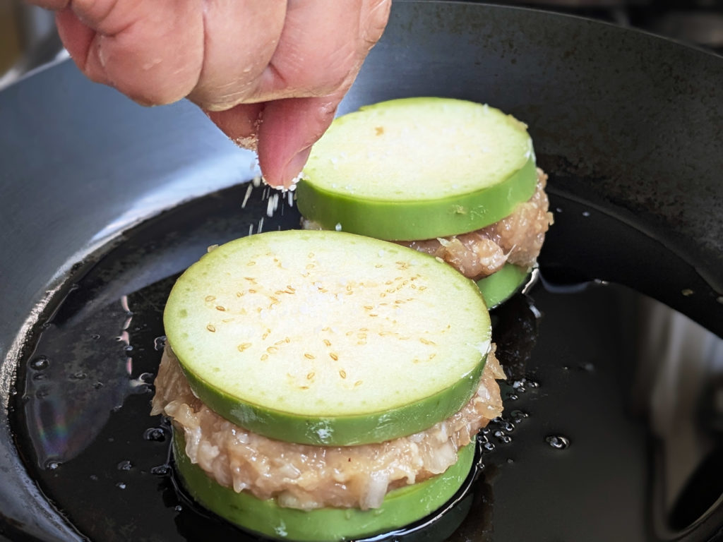④なすの片面にしっかりと片栗粉をふり、片栗粉がついた面を内側にして肉だねを挟む。