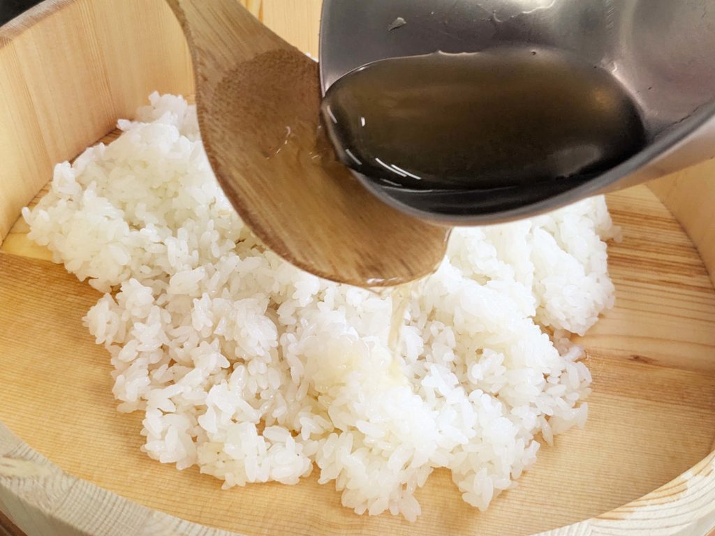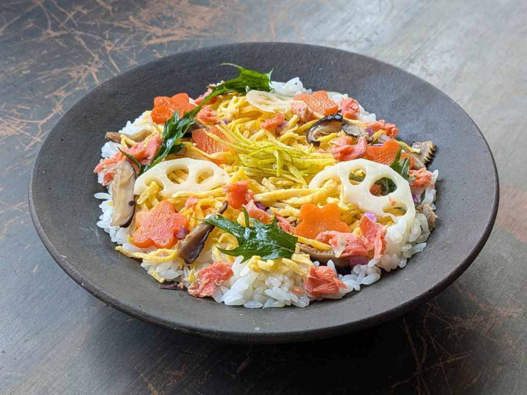 ①寿司飯に、れんこんの甘酢と椎茸の甘煮の半量を混ぜる。