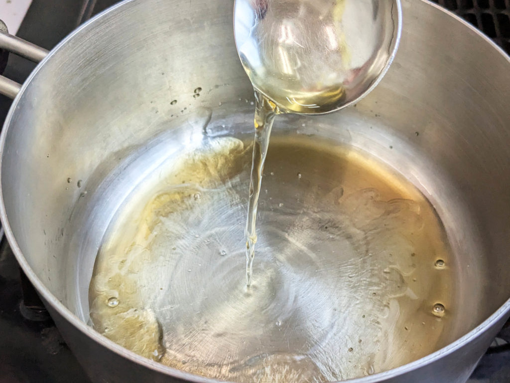 鍋底をゆっくり揺すって、ぬるま湯くらいの温度で砂糖を溶かす(沸騰させない)。