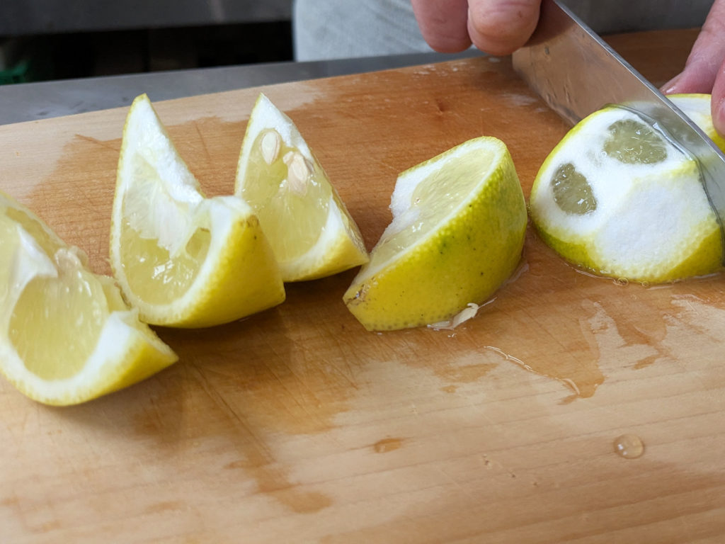 ①だいだいをくし切りにし、種を取りながら絞る。皮は、白い部分を取り除き、飾り用に細切りにする。