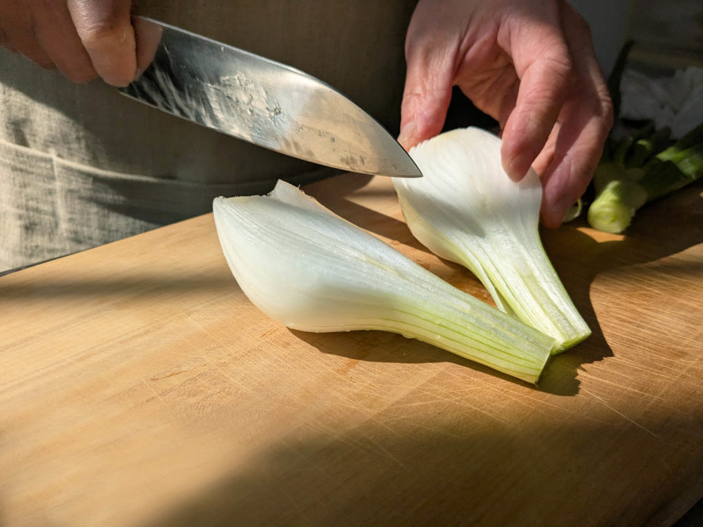 白い部分は縦半分(太ければ4等分)、葉は、3~5cm幅に切る。