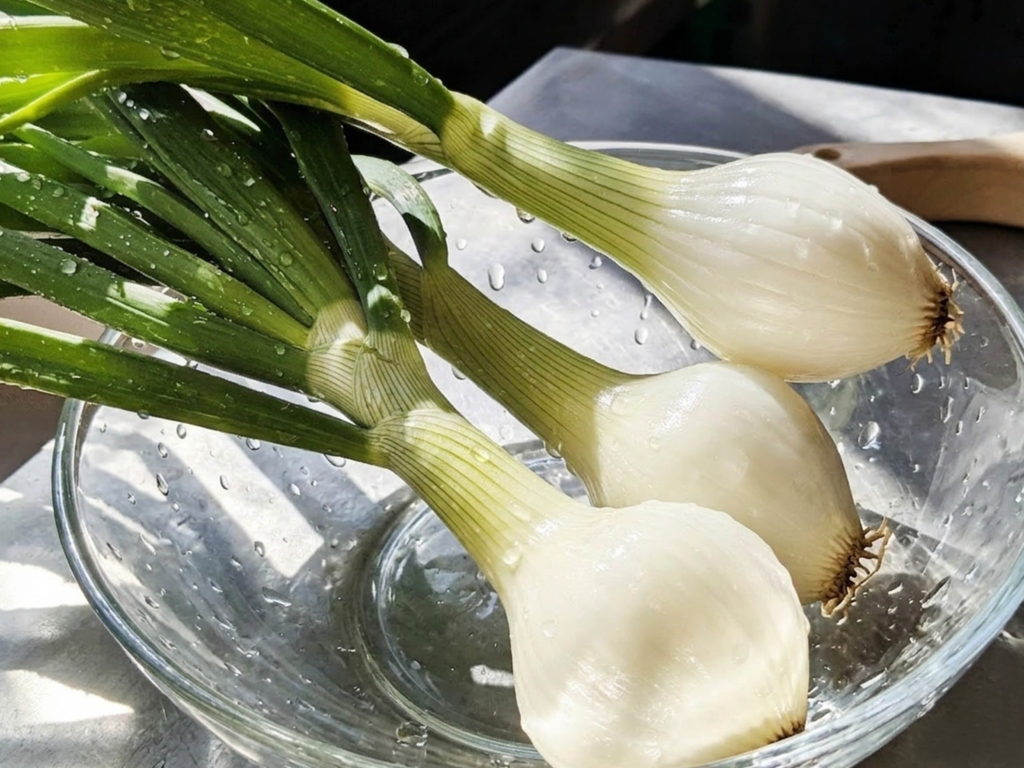 葉たまねぎは、通常の玉ねぎが成長途中の状態で収穫されたもので、葉も球も丸ごと食べられるのが特徴です。みずみずしくて柔らかく、辛みが少なくて優しい甘みが楽しめます。葉の部分はねぎのように、球の部分は玉ねぎのように使え、炒めもの・鍋料理・パスタなど様々な料理にお使いいただけます。軽く焼いて塩を振るだけでも絶品です。