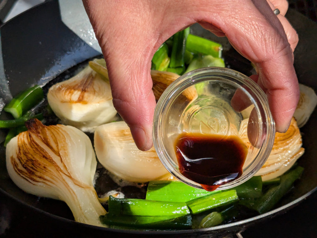 鍋肌から醤油、みりんを回しかけ、全体に絡める。