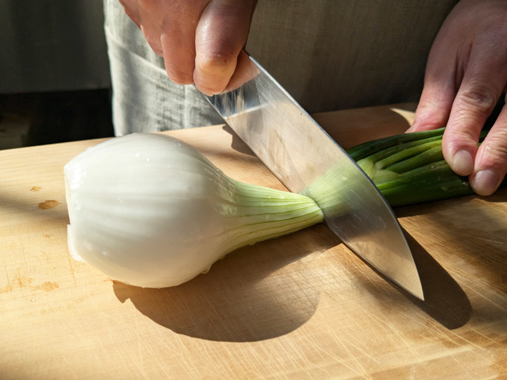 ①葉たまねぎをよく洗い、根元を少し切り落とす。