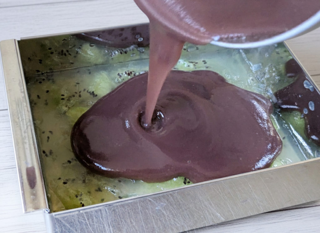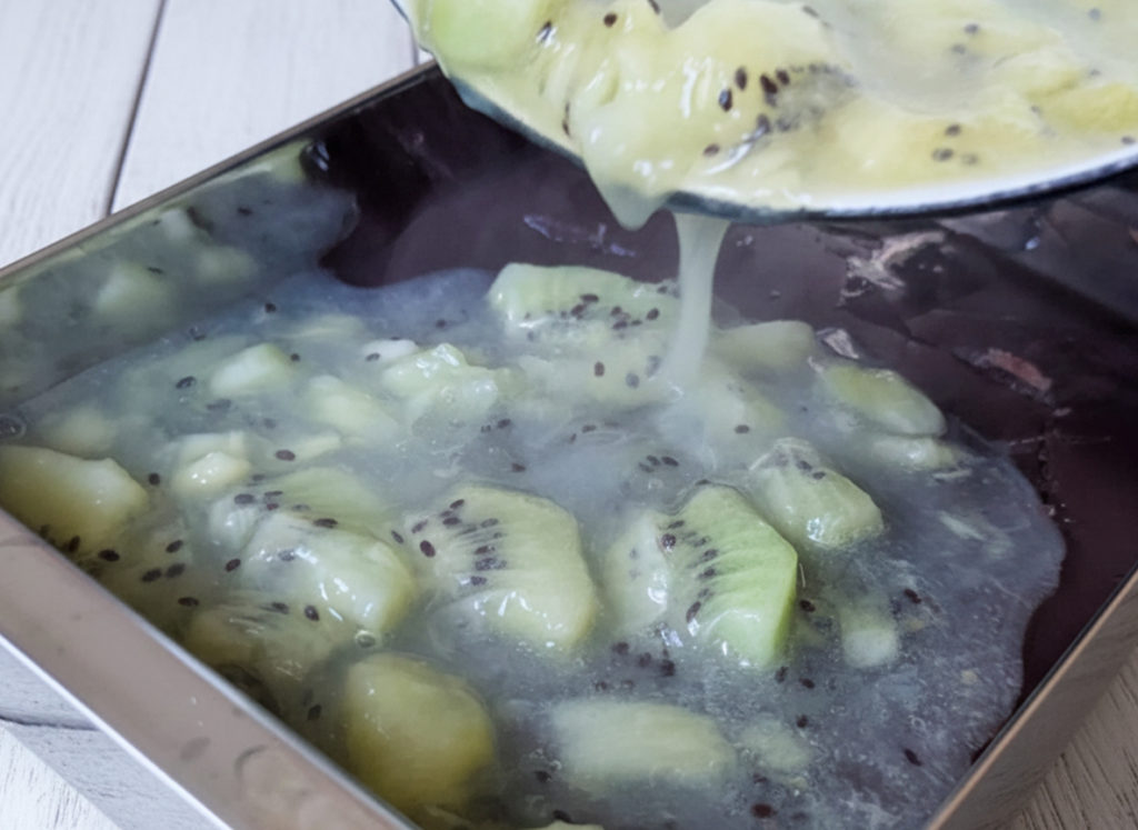 ※ 先に流したキウイ層が固まり過ぎると、仕上がりの際にこし餡層とはがれやすくなります。その場合は、爪楊枝などで表面に数本軽く傷を入れてから、こし餡層を流すと密着しやすくなります。