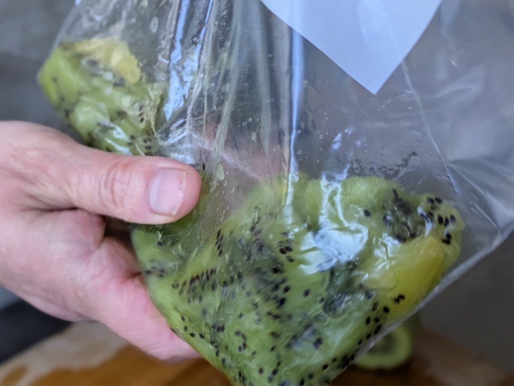 ①キウイは皮をむき、2個のうち1個半は袋に入れて軽くつぶし、残りはいちょう切りにする。