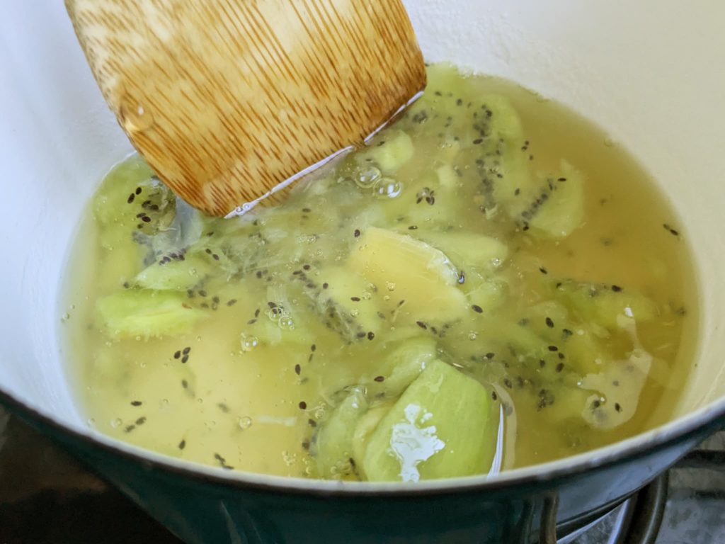 残りのキウイ寒天はそのまま鍋で常温放置。固まり始めたら弱火で軽く温め直せばOK。