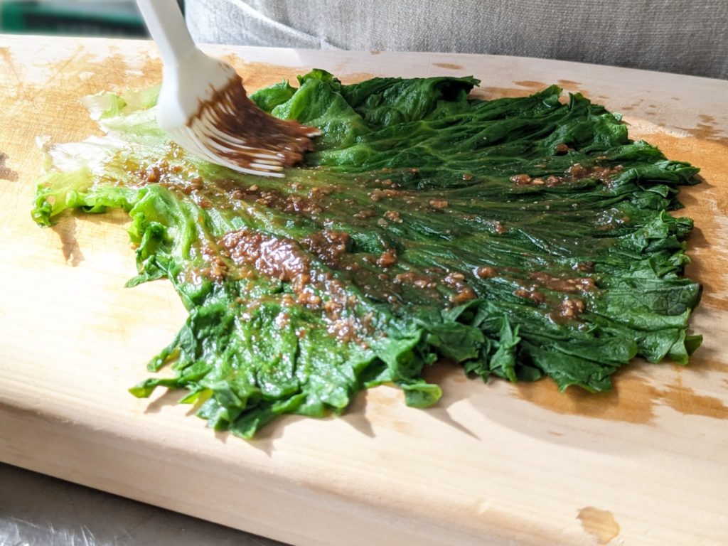 ④レタスを1枚ずつ広げ、表面に薄くハケで塗る。