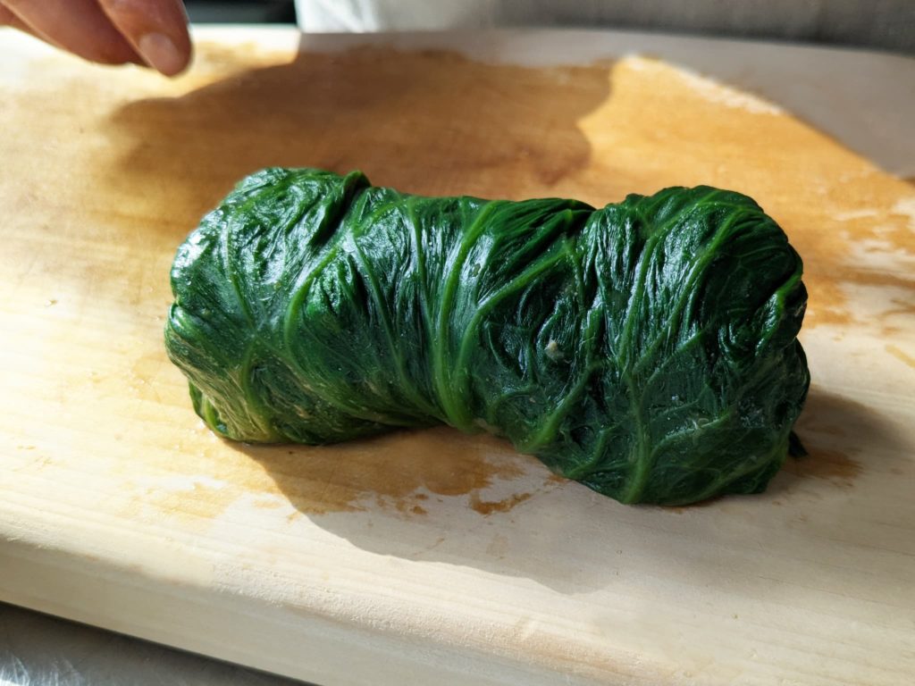⑤外葉1枚、内葉2~3枚を目安に4枚程度重ね、芯側から巻き、両端を折り込み、太巻きにする。同様にもう1ロールつくる。