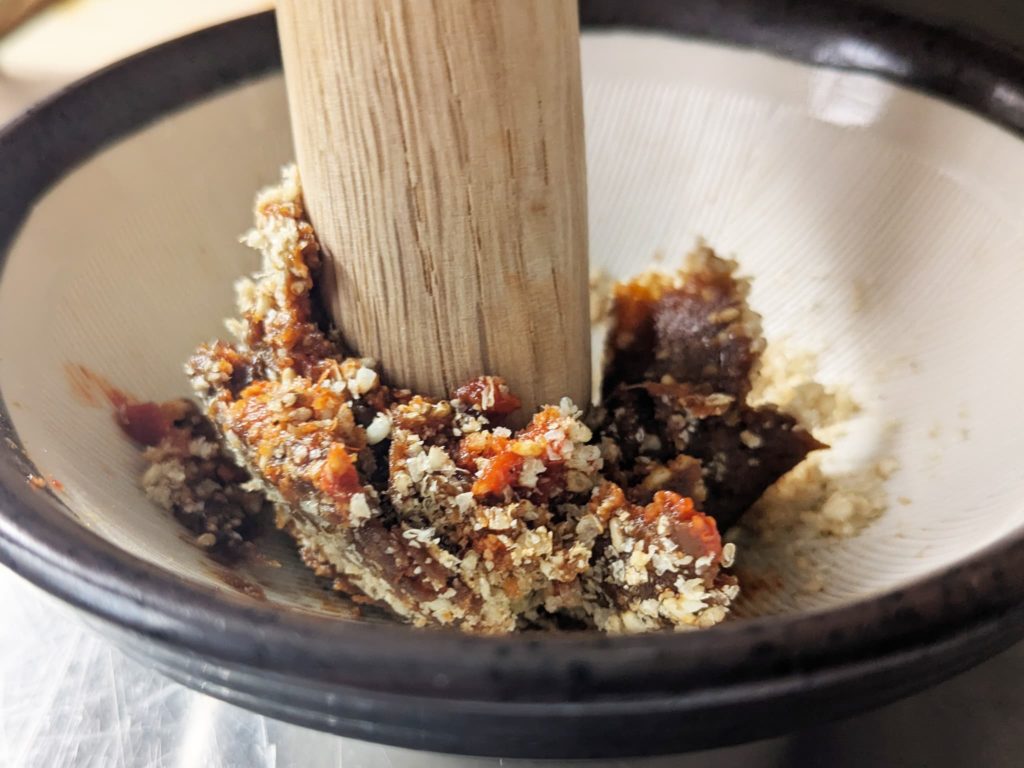 味噌、豆板醤を加え練ったら、甘酒、醤油、酢、ごま油を加え混ぜトロッとさせる。