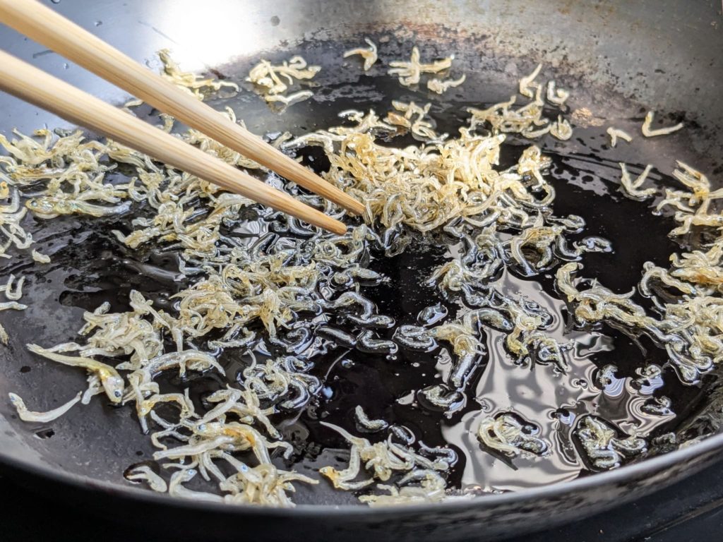 ②フライパンにごま油を熱し、ちりめんじゃこを入れて中火で軽く炒めて香りを出す。