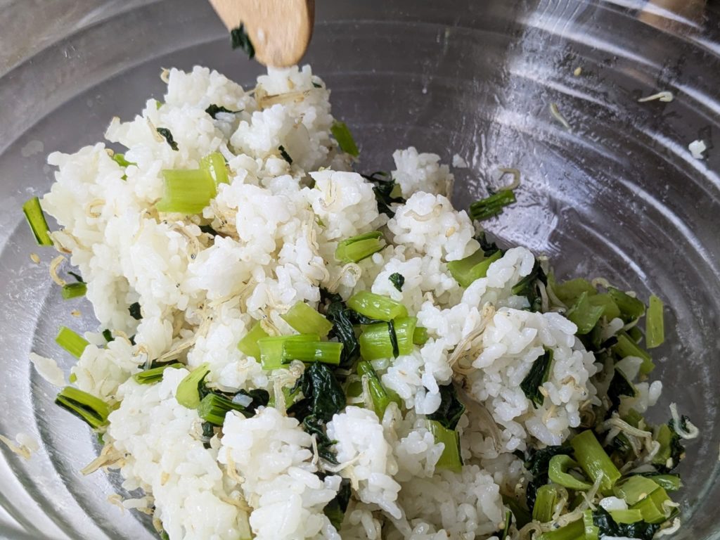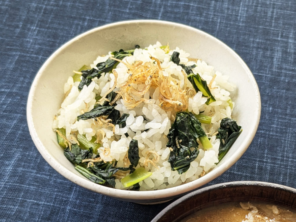 小松菜のシャキシャキとした食感に、じゃこの旨みと白だしの風味がほどよく調和した菜飯です。