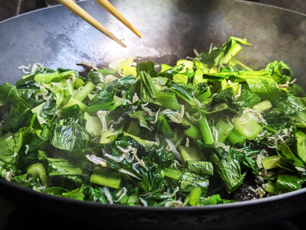 ③小松菜を加えて混ぜ、しんなりしたら白だしを加え、全体になじむように炒める。