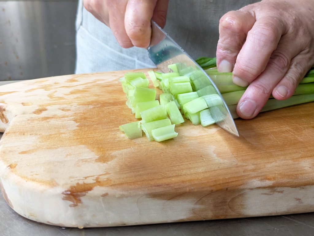 ①小松菜は粗みじん切り(約1センチ幅)にする。大きめの葉は縦に3等分してから横に刻む。