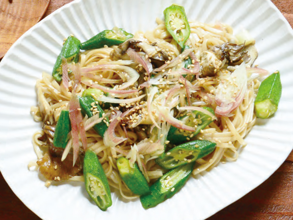 ①オクラはヘタを切り、1cm幅の斜め切りにする。きのこは食べやすい大きさに切っておく。茗荷は縦半分にして、斜め薄切りにする。