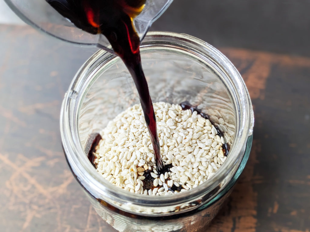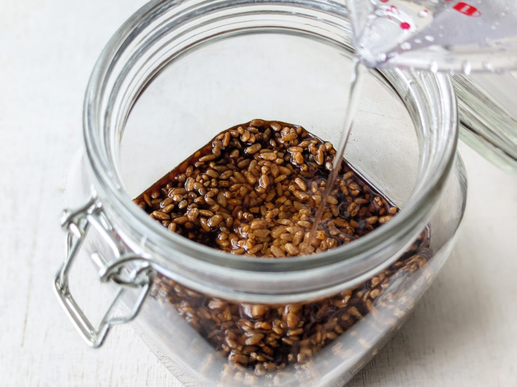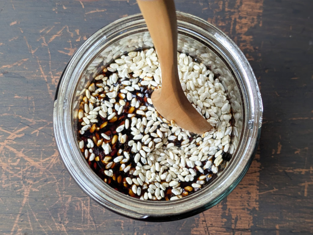 ②米麹が醤油を吸って液面が下がるので、ひたひたになるように少しずつ水をたし、よく混ぜる。(仕込みから3日ほどは良く吸います。)